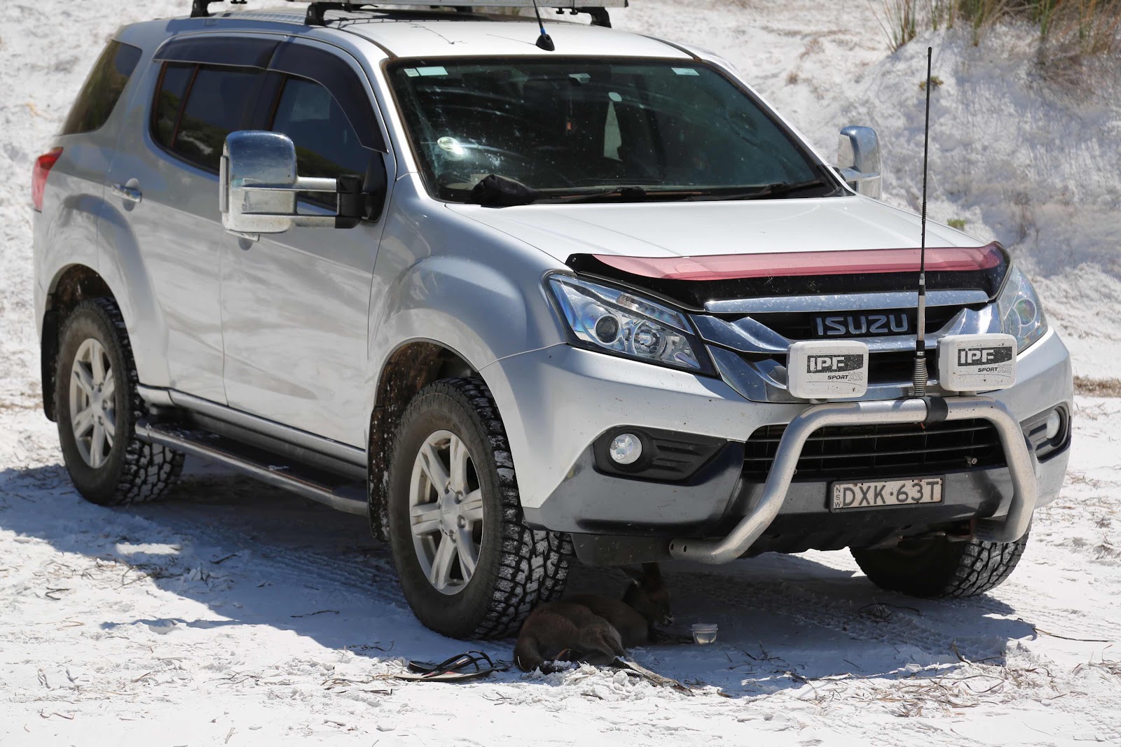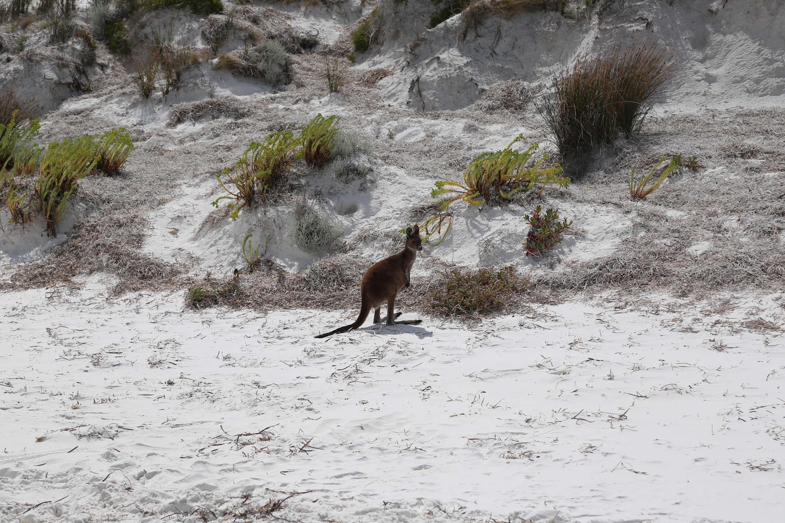 In der Lucky Bay könnte man Kängurus oder Wallabys sehen, wenn es denn welche hätte. Eines haben wir entdeckt, es hat den Schatten unter einem Auto genossen.
