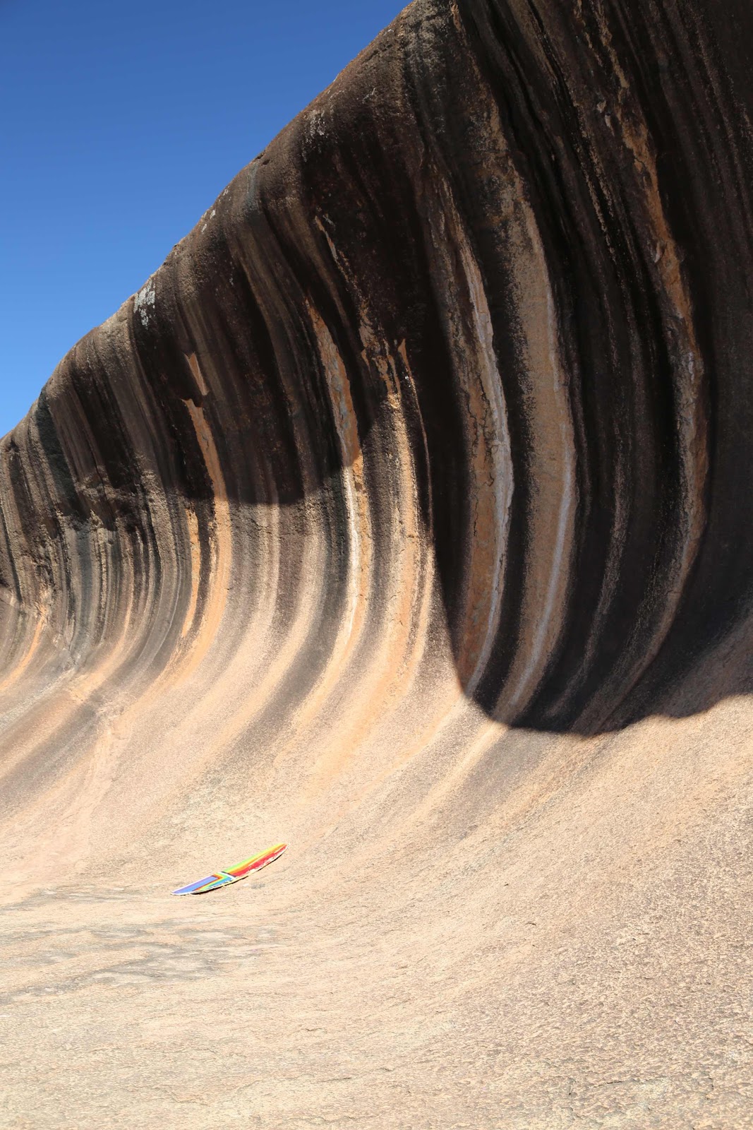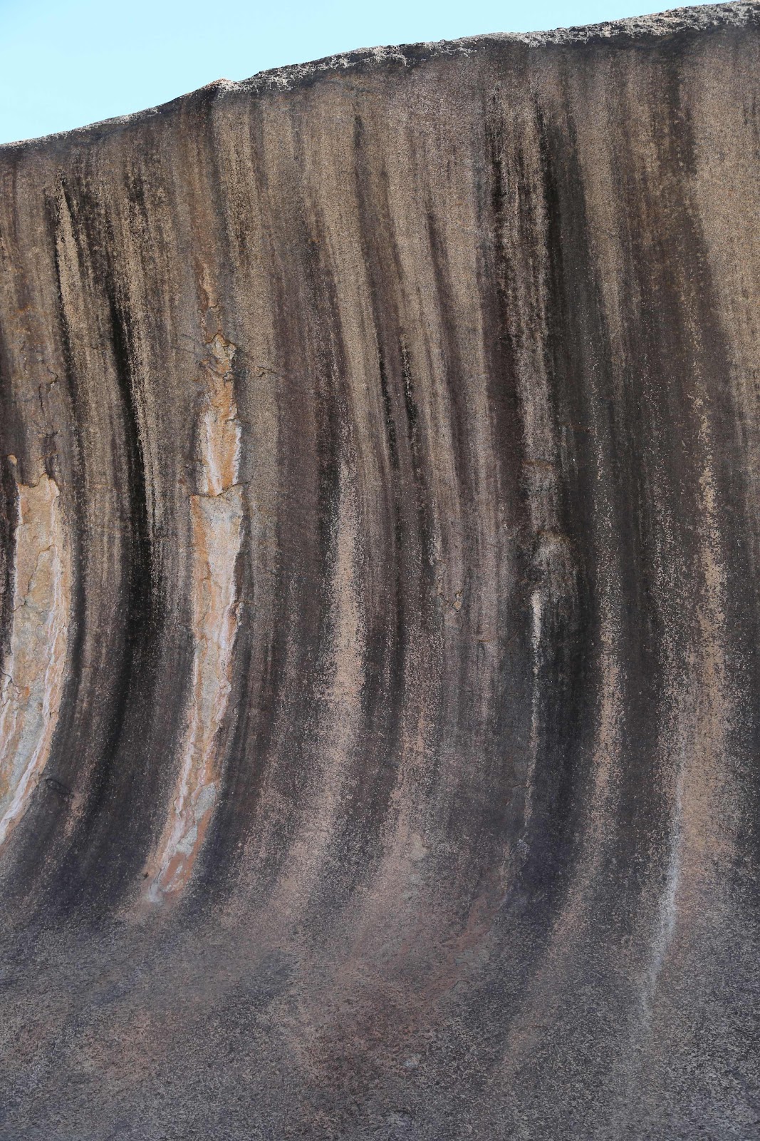 Das heutige Ziel und eines unserer Highlights hier in Western Australia ist der Wave Rock. Es ist eine 15m hohe Granitwelle und zählt zu den meistbesuchten Naturdenkmälern im Südwesten. Die nahezu kahle, 110m lange Felsformation sieht aus wie eine Welle, die kurz vor dem Brechen erstarrt ist. Sie ist mit ihren grauschwarzen Streifen, die das Ergebnis von Wasserabflüssen sind, ein Teil des sonst eher unscheinbaren Hyden Rock. Die Kristalle des Granits werden auf das Alter von 2700 Mio. Jahre geschätzt.