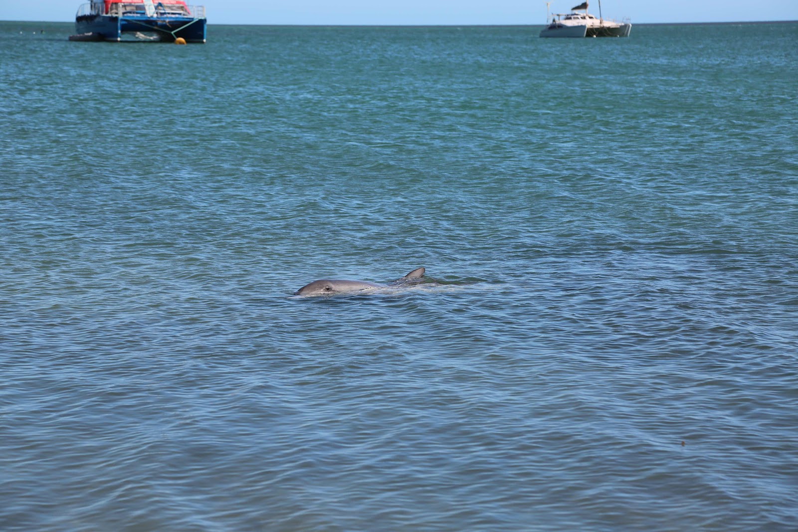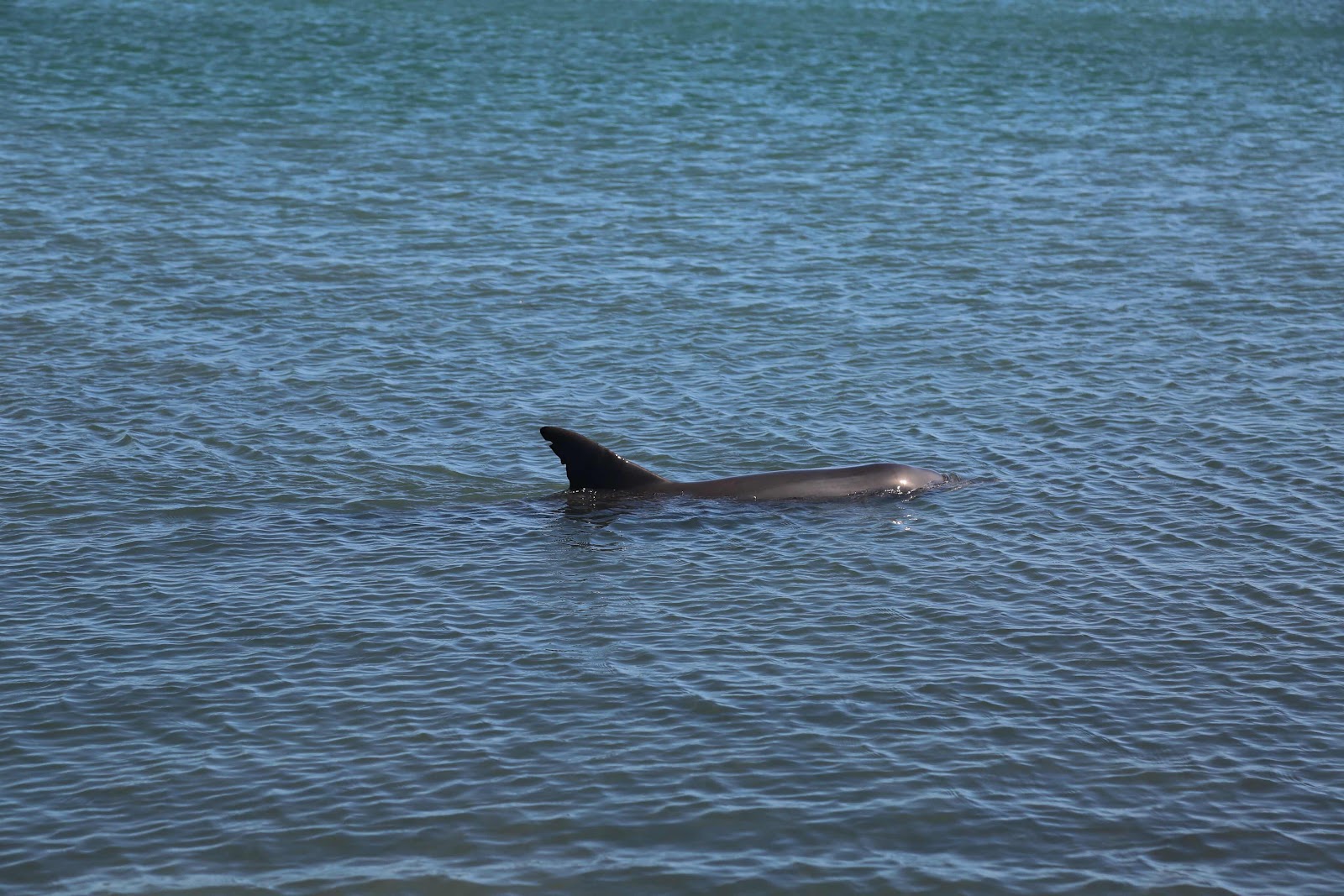 Pünktlich um Viertel vor acht standen wir am Strand und weit und breit kein Delphin, dafür Pelikane.