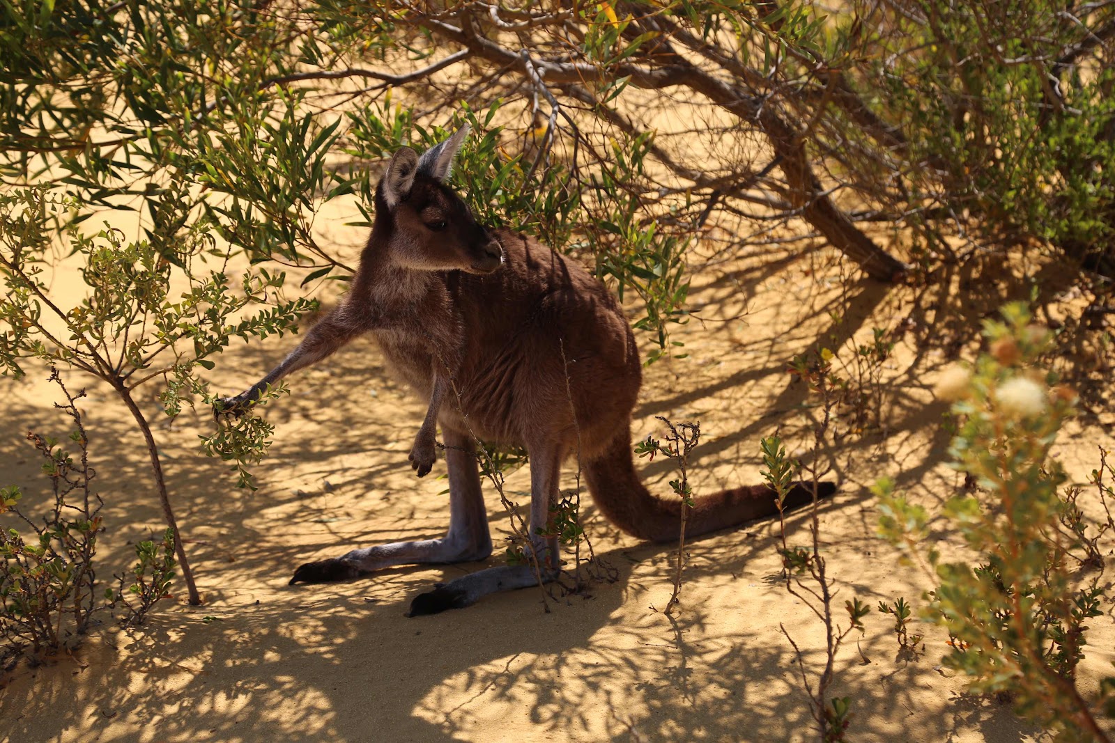 Nach einem kurzen Zwischenstopp und dem Abchecken der Lage, hüpfte er dann relativ nahe an mir vorbei. Da es ein doch grosses Känguru war und sie ja gerne boxen, war ich dann schon ein bisschen angespannt, als es in meine Richtung hüpfte.